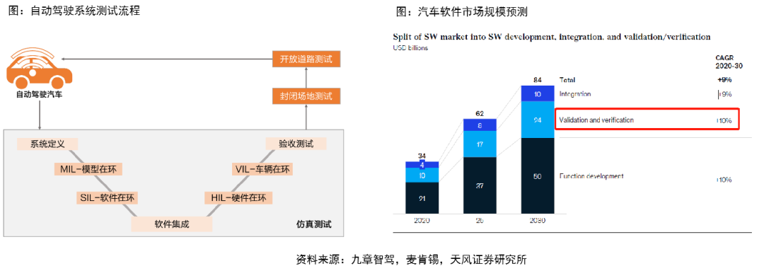 仿真测试、封闭场地测试、开放道路测试三者之间互相补充,形成测试闭环,共同促进自动驾驶车辆的研发和标准体系建立。根据麦肯锡数据,2020年全球汽车软件市场规模约为340亿美元,其中测试和验证市场规模约100亿美元,预计2030年达到240亿美元,2020-2030年CAFR达到10%。