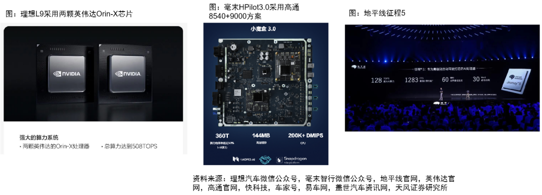 Orin已成为高端车型首选,目前全球已有超过 25 家汽车制造商采用 Drive Orin SoC,在全球领先的 30 家电动汽车制造商中,有 20 家选择 其作为首选的 AI 计算平台。例如2022年6月发布的蔚来ES7、理想L9分别搭载了4颗、2颗英伟达Orin-X芯片,自驾平台算力分别达到1016TOPS、508TOPS;小鹏G9预计2022年下半年推出,预计搭载2颗英伟达Orin芯片。