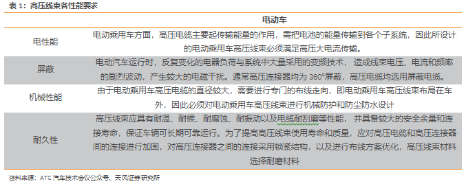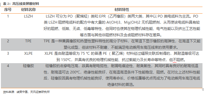 2021新能源汽车已进入快速渗透期,国内车厂实现产业转型需求迫切,电动化目标清晰。从车企看,截止今年8月厂商批发销量突破万辆的企业有比亚迪60858辆、特斯拉中国44264辆、上汽通用五菱43783辆、上汽乘用车16998辆、广汽埃安11619辆。如果按新能源汽车渗透率,比亚迪乘用车达到89.98%,上汽通用五菱达到33%,上汽乘用车达到26%,在双碳目标背景下,中国车企有潜力开创中国汽车产业转型发展的新格局,中国车企未来有望走出一条新型绿色近零碳排放发展新道路。部分国内车企的电动化目标如下图所示:主要国家在碳排放政策上取得共识,新能源汽车需求后劲十足。中国提出碳达峰、碳中和目标之后,日本、英国、加拿大、韩国等发达国家相继提出到2050年前实现碳中和目标的政治承诺。在全球积极应对气候变化的背景下,主要发达国家大力推动绿色低碳交通,提出汽车行业零碳转型目标,对碳排放大户汽车要求进一步严苛,欧洲新政持续加码:2030年汽车二氧化碳排放较2021年减少55%,2035年新车排放归零。电动化渗透率将快速提升,2025年预计达到20-30%。国务院办公厅印发的《新能源汽车产业发展规划(2021—2035年)》曾提出,到2025年,纯电动乘用车新车平均电耗降至12.0千瓦时/百公里,新能源汽车新车销售量达到汽车新车销售总量的20%左右。按照目前高增长态势,新能源汽车20%渗透率目标或将提前实现。从产业层面看,小鹏汽车CEO何小鹏判断“2025年全国新能源汽车渗透率可达30%,在限排政策的超一线城市更可达60%。高压线束作为电动汽车上动力输出的主要载体,是整车性能和安全的关键零部件之一。车内高压线束主要是对新能源车辆提供高压强电供电作用,在新能源汽车中属于高安全件,具有大电压/大电流、大线径导线数量多等特点与传统的车内低压用途相比车内高压电源传输对线束的电性能、屏蔽性能、机械性能和耐久性能都有较高的要求。为保障高压大电流线束使用的安全性,车辆线缆使用的绝缘材料的选择是十分重要的。早期汽车线缆用绝缘材料主要是PVC( 聚氯乙烯),但PVC 中含有铅,对人体有害,近些年来逐渐被LSZH(低烟无卤材料)、TPE(热塑性弹性体)、XLPE(交联聚乙烯)、硅橡胶等材料替代。由于电动乘用车高压电缆在满足高压大电流、抗电磁干扰的同时还要满足耐磨和阻燃等要求,因此对这些材料性能进行了对比:据中国汽车工业协会、天津大学中国汽车战略发展研究中心发布对中国汽车市场的总销量中长期预测显示2025年预测值中值为2697万辆。全球新能源汽车市场方面根据EVTank联合伊维经济研究院在北京发布了《全球新能源汽车市场中长期发展展望(2030年)》,预测到2025年全球新能源汽车销量将达到1800万辆.。预测2025年新能源汽车渗透率为30%。高压线束在新能源汽车中的单车价值量在2500元左右,最后推测高压线束的国内市场在2025将达到202.28 亿,全球市场预计为450 亿。2. 车辆智能化机遇下,高速线缆市场迎来历史性转折2.1. L2智能汽车快速出货,与新能源汽车的技术协同效应明显L2智能汽车快速出货,今年市场渗透率有显著提升。国家工业信息安全发展研究中心日前发布的《智能网联汽车数据安全研究》报告显示,2020年,我国智能网联汽车销量为303.2万辆,同比增长107%,市场渗透率约为15%。2021年一季度,L2智能网联汽车的市场渗透率达到17.8%,新能源汽车中的L2智能网联汽车市场渗透率达30.9%。《车联网产业发展行动计划》锚定车联网基础设施发展目标,彰显国家发展自动驾驶产业决心。2018年底,工信部发布《车联网产业发展行动计划》,彰显了国家对于车联网产业发展的高度重视,明确表示将加大对车联网产业的政策支持力度。该计划明确以2020年为时间节点,分两个阶段实现车联网产业高质量发展的目标,车联网产业发展从示范应用阶段向规模应用阶段跨越。具体为,2020年前,具备高级别自动驾驶功能的智能网联汽车实现特定场景规模应用;2020年后,高级别自动驾驶功能的智能网联汽车和5G-V2X逐步实现规模化商业应用,“人-车-路-云”实现高度协同。2.2. 车辆智能化时代,高性能数据线缆用量将显著提升随着车辆智能化程度的提升,将会带来单车传感器数量的增加和车联网的普及度提升的趋势。在此趋势下车辆线束市场将迎来两个重要变化:1)伴随着传感器数量的增加和V2X 天线数量的提升,在现有技术框架内单车的数据线的用量将会显著提升。2)为了提升智能化车辆行驶的安全性,包括分辨率在内的传感器关键性能的持续提升趋势是非常明显的,这将显著提高数据线缆的传输速率的要求。汽车智能化时代,传感器数量增多会显著拉动线束用量。比起传统车辆,搭载了ADAS系统的车辆需要安装更多的传感器,蔚来ES8搭载了20余个传感器,小鹏P7搭载30余个传感器,北汽极狐阿尔法S华为HI版搭载了34颗传感器,Waymo的第五代自动驾驶系统共约40个传感器。而传感器的数据传输离不开数据线缆的支持。下图清晰展示了车内数据线缆的布设架构,可以发现包括摄像头、激光雷达、毫米波雷达在内的传感都需要不同种类的数据线缆支持。在汽车智能化的大背景下,单车传感器数量快速增加,对于数据线束的用量也将有显著的提升。在汽车智能化时代, 汽车对数据传输需求有显著提升。安全性是汽车智能化提升的核心痛点之一,ADAS 传感器的性能提升和车联网的辅助支持是持