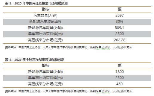 1)新能源汽车已进入快速渗透期,今国内车厂实现产业转型需求迫切,电动化目标清晰。2)高压线束为电动化汽车的重要部件,汽车电动化趋势将显著拉动车用高压线束的用量。高压线束在新能源汽车上作用重要,将高压系统上各个部件相连,作为高压电源传输的媒介,是电动汽车上动力输出的主要载体,主要用于传输电能及屏蔽外界信号干扰。3)以新能源汽车渗透率为30%。高压线束的单车价值量为2500元估算,推测高压线束的国内市场在2025将达到202.28 亿,全球市场预计为450 亿。