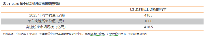 Design Domain,ODD)是指自动驾驶系统功能设定的运行条件,包括环境、地 理和时段限制、交通流量及道路特征等。目前车辆在限定路段中行驶时,仍然没有彻底解决准确感知识别和高精度定位问题。另外还有经济性。为了确保自动驾驶安全,高等级的自动驾驶车辆需要部署更多传感器,大大增加了硬件成本,难以保证车辆的经济性,从而阻碍了规模商业化进程。因此除了单车智能外车辆还将需要的车联网“云-管-端”架构作为补充来实现完全自动驾驶的目标。通过“云”V2X(Vehicle to X)所建立的车与车、车与基站、基站与基站的通信通道,使车辆获得实时路况、道路信息、行人信息等一系列交通信息,从而提高驾驶安全性、减少拥堵、提高交通效率、提供车载娱乐信息等。因此从车辆内部视角来看,需要配备传输速率要求较高和损耗较小的线束以满足VtoX的数据传输需求,RG 58 类型同轴电缆的低损型号就符合相关要求,同轴线缆已在汽车天线应用多年,可良好地在汽车系统内运行。同轴线缆通常可以提供与差分线缆相同的技术性能,物理链路设置的选择由芯片组制造商完成。在未来车联网的应用规划下天线在未来的汽车概念中不仅用于无线电接收,还用于将车辆智能嵌入其环境。因此同轴线缆必须适用于更复杂的安装情况,如外后视镜、车门、发动机舱。据罗兰贝格(Roland Berger)公司的预测显示,至2025年,中国预计有 30%的车辆无ADAS功能,30%的车辆具有L1级功能,35%的车辆具有L2级功能,5%的车辆具有L3级或更高功能。因为自动驾驶车辆的销售增量主要贡献于2021到2025年期间,故推测2025年当年具有L2级及以上的功能的汽车出货量不低于汽车总出货量的40%。据中国汽车工业协会、天津大学中国汽车战略发展研究中心发布对中国汽车市场的总销量中长期预测显示2025年预测值中值为2697万辆。Statista 的研究部门预测,2025年全球的轻型轿车的产量为9300万辆。以L2 及其以上功能的汽车单车高速线束价值 为1000元进行推测,2025年中国车用高速连接器市场总规模为107.88亿元。以L2 及其以上功能的汽车单车高速线束价值为1000元进行推测,2025年全球车用高速线束市场总规模为418.5亿元。对零部件制造企业而言,由于整车制造企业的动力平台具有相当的稳定性和较长的生命周期(一般会在5-7年,期间若有局部优化,生命周期将获得适当延长),一旦整车制造企业将其选定为零部件供应商,就倾向于同其建立长期固定的合作关系。整车制造企业会从供应商历史交付业绩、质量管理、生产能力控制的角度考虑,倾向于保持现有的供应商数量和供应链体系的稳定。汽车零部件制造企业必须满足整车制造企业的内部标准和要求,具备客户认可的技术研发能力、质量保证能力、生产制造能力、成本控制能力等多方面的能力认定。一般来说整车制造企业对供应商的认证过程包括技术评审、质量体系评审、价格竞标、模具开发与制造、试验、检测、小批量生产、装机试用产品试制、小批量试用、批量生产等多个阶段。由于认证过程较为严苛,因此从产品开发到实现大批量供货,整个过程一般需要1-2年的时间。鉴于整车制造企业对合格供应商有着极其严格的资格认证及考核,因此零部件制造企业一旦被纳入整车制造企业的合格供应商目录,就会形成较为稳固的长期合作关系。新进入企业需要在产品质量、生产能力、工艺过程,质量控制、价格和沟通能力等多方面显著超过原有供应商,才能获得整车制造企业的认可。3.2. 技术壁垒:线束行业对厂商同步研发能力和自动化能力要求较高高端汽车线束的总体技术壁垒较高。分产品来看,汽车高速线束作为汽车电路的网络主体,既要确保传送电信号,也要保证连接电路的可靠性,在产品的研发、生产工艺技术、质量控制等方面有着较高的要求。高压线束方面,新能源汽车的快速发展对汽车线束产品的机械强度、绝缘保护、电磁兼容方面都提出更高的要求,汽车及零部件产品的轻量化也是影响续航能力的重要因素。因此,汽车线束企业的研发能力、新材料技术储备、生产工艺及产品质量需更加领先、稳定、可靠。新进入企业规模较小,同步研发实力较弱,产品质量可靠性有待提升,面临较高的技术壁垒。同步研发能力:汽车零部件全球化采购的兴起以及整车企业与零部件企业形成的产业分工协作格局,使得汽车线束企业逐渐参与到整车厂商新车型的设计研发中,对汽车线束企业的产品设计、同步研发能力提出了较高要求。与此同时,汽车产业的不断发展使得每种车型的生命周期逐渐变短,新车研发及其生产周期也相应缩短,因此整车厂商要求汽车线束企业加快产品研发设计,具备同步开发甚至超前开发的能力。同步开发要求汽车线束供应商融入整车配套体系,充分理解整车设计的理念和需求,并根据整车厂商的计划和时间节点配合整车开发进度,及时同步推出汽车线束的设计方案和最终产品。因此,为提高汽车线束企业的整车配套能力,同步研发实力显得愈发重要。这要求线束厂商拥有经验丰富的产品专家,并可以与汽车生产商、一级供应商和插座制造商长期保持密切联系。自动化能力:伴随着人力成本高企及汽车整车制造商对产品质量的持续追求,汽车线束行业对设计、生产、物流的自动化水平也提出了更为苛刻的要求。国内绝大多数线束厂局部自动化水平
