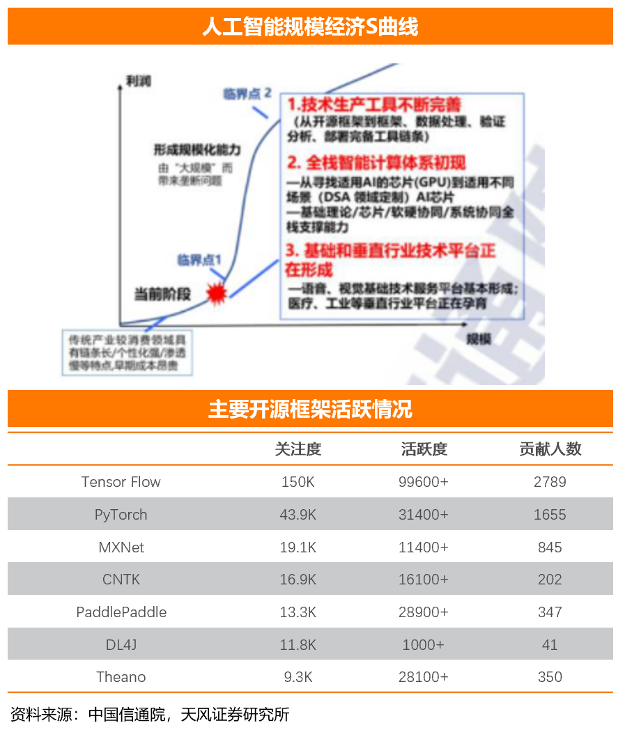 AI生态迅速扩张。讯飞开放平台开放着已经达到175.6万、累计支持终端28.9亿。腾讯AI开放平台客户数达200万,服务全球用户数量更是超过12亿。研发方面,谷歌TensorFlow、脸书PyTorch因先发优势和大厂背书,已占据市场主流地位。如TensorFlow在工业界的领先使其长期稳居第一,市场关注度超第二名3倍。PyTorch则凭借易用性异军突起,在顶级学术论文中占比超过50%。