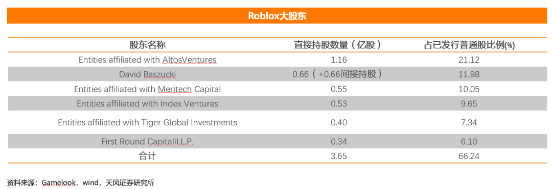 2021年3月10日,Roblox正式在纽交所上市。Altos Ventures是最大股东,以1.16亿股数持有公司21.12%的股份。Meritech Capital紧随其后,拥有Roblox10.05%的股份;Index Ventures占股9.65%;Tiger Global占股7.34%。