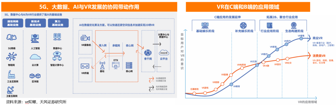 借助5G、云计算与AI技术,VR产业将进入快速发展期,未来VR产业比拼的是数据体量与精细度。5G、云计算与AI为VR行业提供强大的基础设施,加速VR在商用领域的落地进程。VR在软件、硬件和内容等领域已经取得显著突破,而数据成为VR厂商竞争的关键。未来无论是三维空间重建还是深度AI应用,更大体量和更细颗粒度的数据是VR在商用领域持续发展的根基。