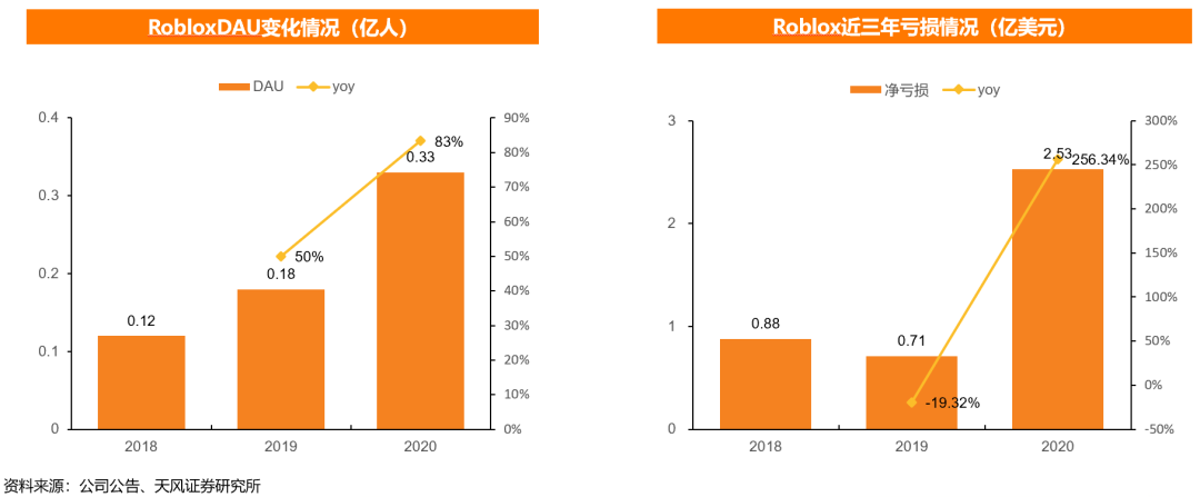 Roblox公司的用户参与度这些年间持续增长,DAU从2018年的1200万,在2019年增长到1760万,2020年增至3260万,该平台活跃开发者数量接近800万人。