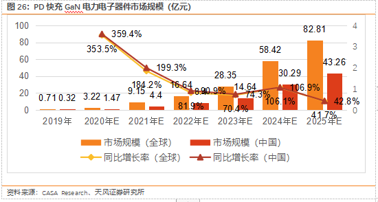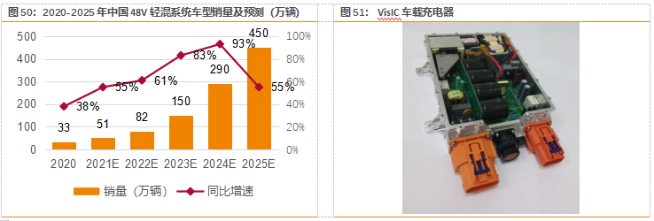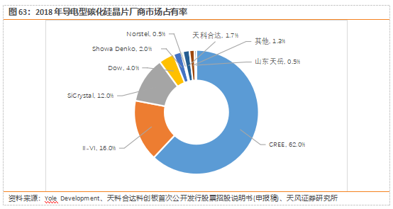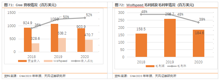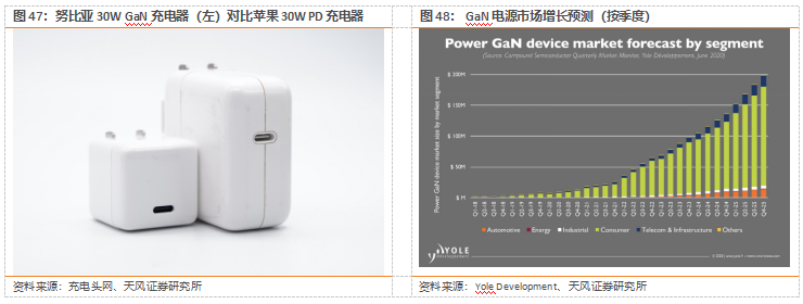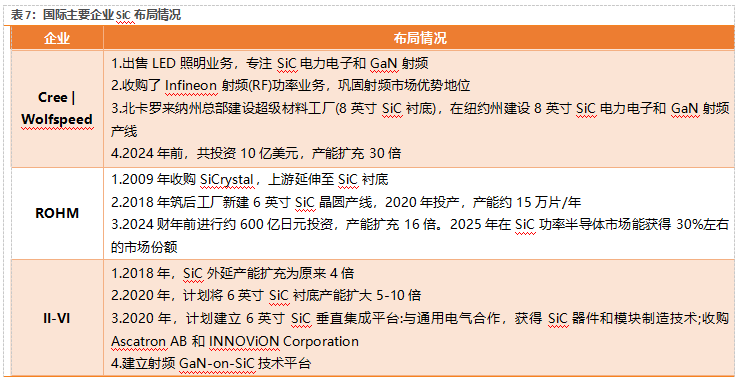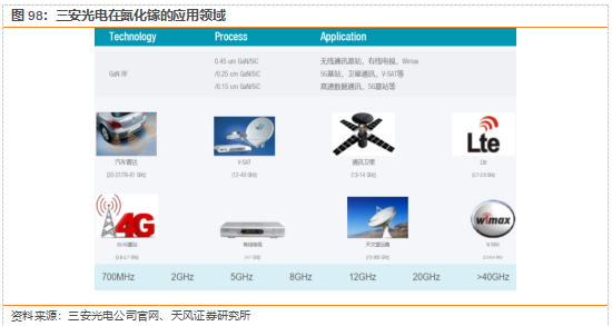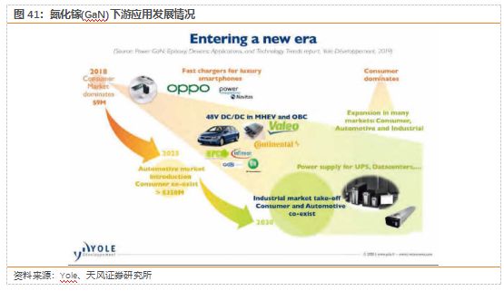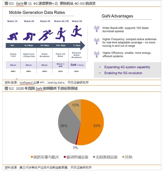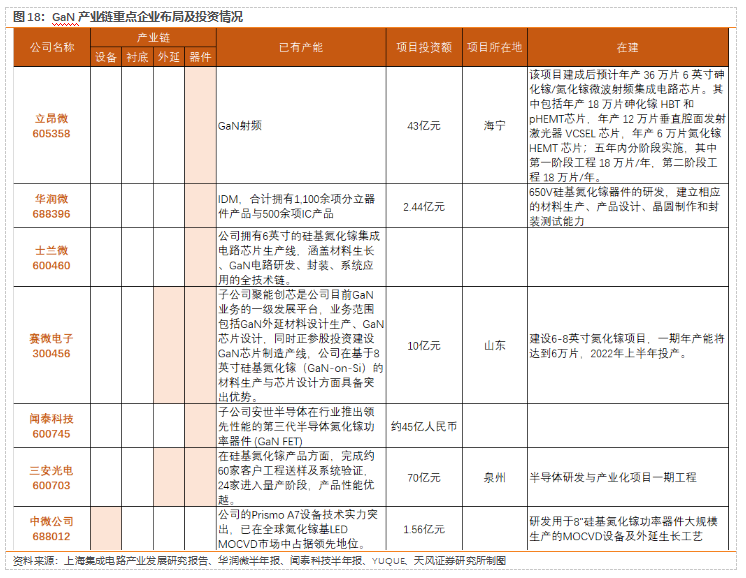 基于GaN-on-Si技术的Micro-LED有效提升显示品质,符合未来发展趋势。在物联网和 5G 新时代,光电子市场作为GaN的主要应用方向,具有较大潜力。4.3.GaN在电力电子市场深受认可,消费快充+汽车电子增长空间广阔GaN在电力电子市场深受认可,增长空间广阔。由于GaN器件相比于SiC器件拥有更高的工作频率、更低的导通电阻和更低的最低阈值电压,使用GaN器件制作的功率器件将拥有更强的转换效率和更小的器件体积,所以GaN电力电子器件更适合对高频率、小体积、成本敏感、功率要求低的电源领域。未来GaN在电力电子市场的增长空间主要集中在消费快充和汽车电子。GaN电源市场将成为GaN在电力电子领域最强的推动力,Yole预测市场规模将在未来五年超过15亿美元。GaN具有推动无线感应高频充电方案发展的潜力,未来将更多地配备在高端电动车上。车载方面,GaN电力电子器件能够有效减少逆变器尺寸、重量和系统成,因此在48V的混合动力汽车领域将拥有较强的竞争力。GaN可用于48V DC/DC以及OBC(On board charger 车载充电机)。高工产研预计48V轻混系统车型将在中国迎来高速发展期,在2020年至2025年的五年时间里,实现年均增长率69.4%,年销售量从33万辆增长到450万辆。同时GaN电力电子器件也可用于车载充电器(OBC),如以色列VisIC公司设计的6.7 kW GaN车载充电器实现了更低的功率损耗,更小的体积和更轻的重量,帮助电动汽车精简冷却系统、缩短充电时间,缩小尺寸并降低成本。4.4.GaN在射频领域市场潜能可观,为5G时代功率放大器核心在射频通信领域,GaN是未来最具成长潜能的半导体材料之一。与GAAS、InP相比,GaN器件输出功率更大,与Si LDMOS和SiC器件相比,GaN的射频特性更好,GaN射频器件已成为5G时代功率放大器主要技术。2)更高频率:活动天线基于更高的频率可以做到实时动态覆盖GaN赋能5G单片前端解决方案,5G的蓬勃发展将会促进GaN应用的进一步推广。5G基站建设放量为GaN市场带来增长空间。根据前瞻产业研究院关于 5G 基站建设预测数据,未来5年中国 5G 基站建设将迎来高峰,每年投资金额为 3000 亿—5000 亿元,5 年总投资超过 2 万亿元。除5G外,GaN在雷达和电子战系统中具有优势,军工市场是GaN射频器件市场的主要推动力。GaN当前已在关键的国防细分市场上展现出优势,国防应用需求的稳定性也将为GaN市场增长保驾护航。Si基GaN和SiC基GaN射频器件已逐步成为5G功率放大器尤其宏基站功放大器的主流技术路线。4.5.GaN异质外延方面产品线持续扩充完善,Si基 GaN、SiC 基 GaN前景广阔GaN异质外延方面产品线持续扩充完善,各类技术并行发展。由于具有价格低、生长速度快以及对CMOS工艺兼容等优势,Si基 GaN有望在电力电子应用方面成为市场主流,但性能略逊于 SiC 基 GaN。硅基氮化镓商用仍在起步阶段,有望提供经济高效和可扩展的解决方案,Yole Development市场规模将在2026年达到1.73亿美元,复合年增长率达到86%。SiC基GaN 器件是射频市场主流产品和技术解决方案,性能相对较佳,但价格高于Si 基 GaN。在RF GaN行业,Si基GaN和SiC基GaN技术已成为RF功率应用方面LDMOS和GaAs的有力竞争者。在GaN 射频应用方面,对于 SiC基 GaN 工艺,研发能力逐渐提升,技术逐渐成熟。Si 基 GaN 射频应用属于非主流路线,但其成本优势在未来有较大竞争力,因此也有不少企业在布局。国内外Si 基 GaN 外延片主流尺寸为 4英寸和6 英寸,并逐步向 8 英寸发展。GaN 光电子应用方面,Mini/Micro-LED 用 Si 基 GaN 外延片实现 8 英寸材料产业化,代表企业有晶湛半导体、晶能光电等。 多家晶圆代工厂和IDM均将生产Si基GaN 和SiC基GaN视为重点发展对象。IDM方面,国际龙头企业进一步扩大自身优势。2018 年,Cree收购了英飞凌的RF部门, 该部门主要设计制造LDMOS放大器,同时拥有GaN-SiC/Si器件生产能力。收购完成后,Cree成为了全球最大的GaN射频器件供应商。Cree除为自家生产GaN射频器件外,还向外提供GaN代工生产服务。而Qorvo在GaAs的基础上,进一步发展了SiC 基 GaN;MACOM则在早期看好Si 基 GaN工艺,近年也开始发展SiC 基 GaN。5.1.1.全球展开全面战略部署,各国抢占第三代半导体战略制高点市场需求增强,龙头企业不断扩大产能,抢占市场份额。2019 年,Cree 宣布投资 10 亿美元扩大 SiC 产能,建造一座采用最先进技术的自动化 200mm SiC 生产工厂和一座材料超级工厂,实现 SiC 晶圆制造产能和 SiC 材料生产的 30 倍增长,以满足 2024 年之前的预期市场增长。近日,科锐首席执行官也再次确认,其位于纽约州马西镇的碳化硅(SiC)晶圆厂有望在2022年初投产,该厂于2019年开始建设,为“世界上最大”的碳化硅晶圆厂,将聚焦车规级产品,是科锐10亿美元扩大碳化硅产能计划的一部分,也是该公司有史以来最大手笔的投资。同时,科锐宣布与意法半导体(ST)扩大现有的多年长期碳化硅(SiC)晶圆供应协议。根据新的供应协议,科锐在未来几年将向意法半导体提供150毫米碳化硅裸片和外延片。1.美日欧均推进第三代半导体技术的研发项目,抢占技术制高点。2.日本建立了“下一代功率半导体封装技术开发联盟”。3.欧洲启动了产学研项目“LAST POWER”。5.1.2.SiC美国优势显著,欧洲产业链完备,日本在设备和模块技术方面领先目前,碳化硅晶片产业格局呈现美国全球独大的特点。以导电型产品为例, 2018 年美国占有全球碳化硅晶片产量的 70%以上,仅 CREE 公司就占据一半以上市场份额,剩余份额大部分被日本和