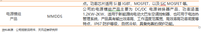 4)电源模组产品:主要指MMDDS系列。公司的电源模组产品主要为DC/DC电源转换器产品,功率涵盖1.2KW-2KW,适用于新能源纯电动大巴车空调控制器,也可用于电池热管理系统,产品具有输出效率高、工作温度范围宽、高效率高功率密度等特点,IP67防护等级,自然冷却,具备完善的保护功能。