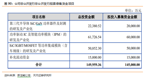 2021年11月公司发布2021年度非公开发行A股股票预案。本次非公开发行拟募集资金总额不超过14.5亿元;本次募集资金投资项目包含:1)第三代半导体SiC/GaN功率器件及封测的研发及产业化,将新增SiC/GaN的封装测试产线,实现部分器件的自主封装,本募投项目建设期为24个月,预计按计划投入建设并如期投产后的第1年达产率为40%,第2年达产率为 80%,第3年起达到设计生产能力。2)功率驱动IC及智能功率模块(IPM)的研发及产业化助于与公司现有产品形成配套,并延伸产品应用,为客户提供全面位、多样化的产品和服务。3)SiC/IGBT/MOSFET等功率集成模块(含车规级)的研发及产业化目在公司原有MOSFET、IGBT等单管的研发基础上延伸相关模块研发及产业化,有利于公司进一步抓住下游行业发展的契机,并在光伏新能源及新能源汽车等新兴应用领域占据更大的市场份额。