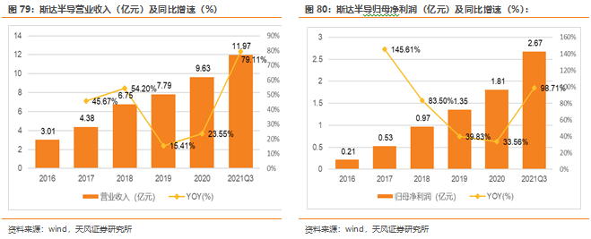 下游需求快速增长叠加国产替代进程持续加速,有望带动公司业务持续向上。公司2020/2021Q3年实现营收9.55/10.99亿元,同比增长23.62%/65.05%,归母净利润为1.39/3.11亿元,同比增长41.89%/207.83%。2021年上半年,半导体行业上游晶圆代工产能紧张、海外疫情持续紧张导致进口元器件供应不足,叠加各下游行业,如汽车、光伏逆变器等需求快速增长,带动功率半导体需求求持续向上;国产替代进程进一步加速,公司的MOSFET、IGBT等产品需求有望保持快速增长。