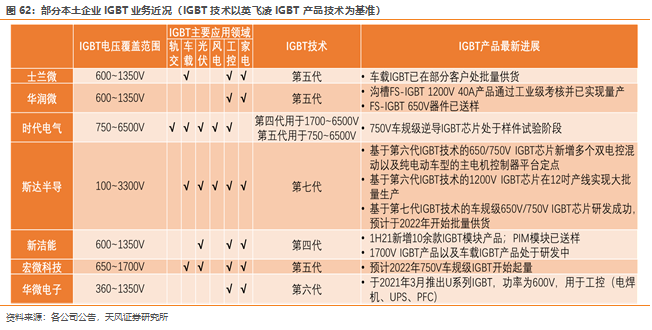 国内企业积极开拓IGBT产品线,积极技术升级,紧抓国产替代机遇。由于新能源汽车是IGBT市场增长的主要驱动力之一,国内厂商纷纷积极布局车载IGBT业务。士兰微车载IGBT产品已在部分客户处批量供货;时代电气750V车规级逆导IGBT芯片已处于样件试验阶段;斯达半导基于第七代IGBT技术的车规级650/750V IGBT芯片已研发成功,并预计于2022年开始批量供货;宏微科技750V车规级IGBT预计于2022年开始起量。