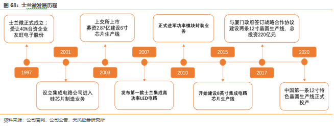 前瞻性布局12英寸晶圆产能,国内第一条12英寸IDM特色工艺产线。士兰微电子股份有限公司成立于1997年,是专业从事集成电路芯片设计以及半导体微电子相关产品生产的高新技术企业,是目前中国规模最大的集成电路芯片设计与制造一体(IDM)的半导体企业之一。2003年公司正式在上交所上市,募集资金2.89亿用于6英寸晶圆生产线以及集成电路新品研发。2015年,公司8英寸集成电路芯片生产线在下沙芯片制造基地奠基。2017年与厦门沧海区政府签订战略合作协议建设两条12英寸特色工艺晶圆生产线。IC Insights 在2021年2月集成电路芯片制造企业的产能排名中,公司在6英寸及以下的芯片制造企业中生产规模居全球第2位。