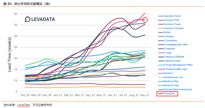 IGBT除了新能源汽车也常被用于光伏、风电、工控、家电、轨交等领域;受益于碳中和趋势推动,IGBT迎来广阔的成长空间。IGBT目前生产大多以8英寸晶圆为主,需求增速大幅高于供给增速,因此8英寸晶圆需求一直保持高位。供需缺口使得IGBT产品货期持续拉长,截至2021年Q3仍未出现缓解的现象;英飞凌与Microsemi部分IGBT产品的交货周期已延长至50周,且相关产品价格也表现出上涨的趋势。
