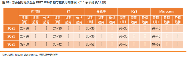 国际龙头企业IGBT产品价格与拉货周期,均呈现上涨态势。由于产能持续紧缺,2021年IGBT产品货期持续拉长,且在Q3仍未出现缓解的现象。英飞凌与Microsemi部分IGBT产品的交货周期已延长至50周。此外,ST、安森美、IXYS等国际龙头企业IGBT产品交货周期也呈现出继续延长的趋势,且相关产品价格也表现出上涨的趋势。