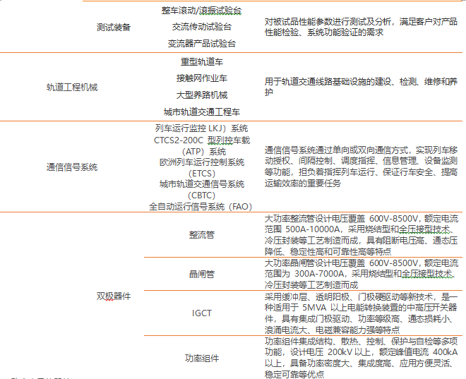 1)轨道交通装备:保持国内领先地位。包括轨道交通电气装备、轨道交通工程机械和通信信号系统,主要用于干线铁路、城际铁路、城市轨道交通等。其中,公司自主研发成功的牵引变流系统,打破了早期国际巨头的技术垄断,不仅在国内保持领先地位,还远销欧洲、美洲、亚洲多个国家和地区,助力我国轨道交通产业的发展。