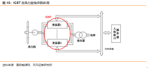 IGBT在风电市场中主要应用于风电变流器。风电变流器作为风力发电机组的关键部件之一,可以使风机处于最佳发电状态,同时将风力发电机发出的频率、幅值不稳定的电能转换为频率、幅值稳定的、且符合电网要求的电能后并入电网。IGBT是风电变流器的重要部件之一,变流器可通过提高IGBT等功率器件的耐压和容量来提高风电系统的功率等级。
