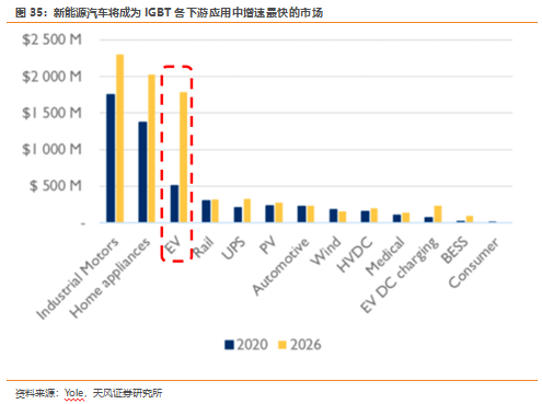新能源汽车是IGBT各应用中增速最快的市场。随着新能源汽车渗透率的提升,IGBT应用数量也将快速增长,带动新能源汽车用IGBT市场的扩大。Yole预计2020~2026年,新能源汽车用IGBT市场规模将从5.09亿美元增长至17亿美元,年复合增长率达到22.26%,成为增速最快的IGBT下游应用。