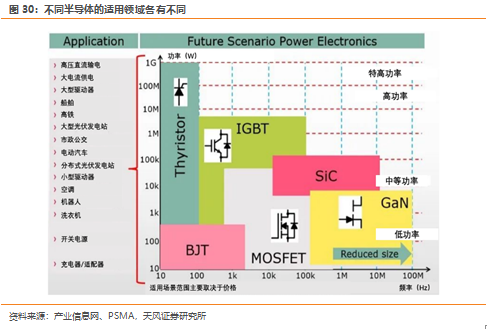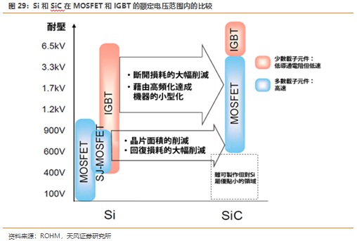 新材料推进新产品发展,高压高频领域适用SiC。碳化硅在绝缘破坏电场界强度为硅的10倍,因此SiC可以以低电阻、薄膜厚的漂移层实现高耐压,意味着相同的耐压产品SiC的面积会比Si还要小,比如900V SiC-MOSFET的面积是Si-MOSFET的1/35。因此,硅基的SJ-MOSFET只有900V左右的产品,SiC可以做到1700V以上且低导通电阻。Si为了改善高耐压化所带来的导通电阻增大主要采用IGBT结构,但由于其存在开关损耗大产生发热、高频驱动受到限制等问题,所以需借由改变材料提升产品性能。SiC在MOSFET的结构就可实现高耐压,因此可同时实现高耐压、低导通电阻、高速,即使在1200 V或更高的击穿电压下也可以制造高速MOSFET结构。