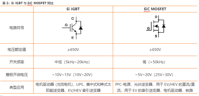 SiC MOSFET具备一定优势,但成本较高。就器件类型而言,SiC MOSFET与Si MOSFET相似。但是,SiC是一种宽带隙(WBG)材料,其特性允许这些器件在与IGBT相同的高功率水平下运行,同时仍然能够以高频率进行开关。这些特性可转化为系统优势,包括更高的功率密度、更高的效率和更低的热耗散。然而,受制于制造成本和产品良率影响,SiC产品价格较高。由于Si越是高耐压的组件、每单位面积的导通电阻变高(以耐压的约2~2.5倍增加),因此600V以上的电压则主要使用IGBT。但是IGBT是藉由注入少数载子之正孔于漂移层内,比MOSFET可降低导通电阻,另一方面由于少数载子的累积,断开时产生尾电流、造成开关的损耗。SiC由于漂移层的电阻比Si组件低,不须使用传导度调变,可用高速组件构造之MOSFET以兼顾高耐压与低电阻,可实现开关损耗的大幅削减与冷却器的小型化。SiC在制造和应用方面又面临很高的技术要求,因此SiC Mosfet价格较Si IGBT高。