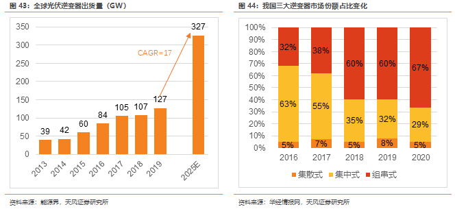 光伏逆变器出货量增长带动IGBT需求提升。根据BNEF数据,2019年底累计光伏装机容量超过风电装机,成为仅次于煤炭、天然气、水电的全球第四大发电来源。受益于各国对新能源的推广,全球光伏新增装机量GW级市场增大,带动光伏逆变器需求快速增加。2013~2019,全球光伏逆变器量从39GW增长至127GW,年复合增长率达到22%,且预计将于2025年增长至327GW。IGBT作为光伏逆变器中的重要构成部件,市场规模也将随光伏逆变器需求量增长而扩大。光伏逆变器主要可分为集散式、集中式和组串式。集中式光伏逆变器的设备功率在50KW~630KW之间,采用大电流IGBT;组串式光伏逆变器功率小于100KW,IGBT被用于其功率开关零部件。同样的功率下,组串式光伏逆变器数量多于集中式光伏逆变器。随着组串式逆变器应用占比的提升,光伏用IGBT数量有望有所增长。