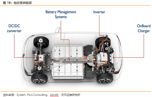 电力系统主要分为四大类:DC/DC转换器、电池管理系统(BMS)、逆变器、车载充电器。1)电池管理系统作为电池安全运用的有力保障,使得电池时刻处于安全和可控制的充放电使用过程中,大大提高了电池在实际使用过程中的循环使用寿命;2)车载充电器是内置在车辆里,用于停车时从交流电网为高压电池再充电的系统;3)逆变器的作用在于将汽车12V或24V(货车用)直流电转换为和市电相同的220V交流电;4)DC/DC转换器的作用在于把常电处理成其它电路设备用的小电压,或把原先的电源加以优化,使得供电系统更加稳定,同时,DC/DC转换器也有保护的作用。