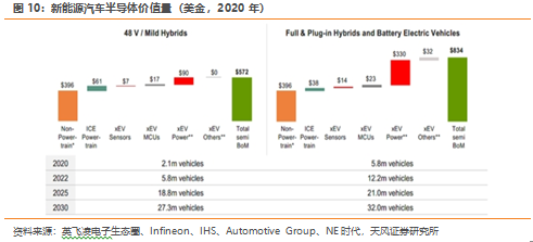 2020年新能源汽车半导体价值量834美金。根据英飞凌、IHS、Automotive Group等多家机构测算,2020年FHEV、PHEV、BEV单车半导体的成本到了834美元,相较于传统燃油车的汽车半导体价值417美元,单车半导体价值量翻倍成长;相较于48V轻混合车,单车半导体价值量增加45.8%。预计2025年,48V轻混车、FHEV/PHEV/BEV销量分别将达到1880万辆、2100万辆,基于2020年单车半导体BOM静态测算,2025年车用半导体市场规模将达到282.7亿美元。