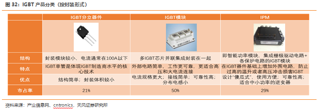 IGBT根据封装形式可分为IGBT分立器件、IGBT模块以及IPM。从封装形式上来看,IGBT可以分为IGBT分立器件、IGBT模块和IPM三大类产品。IGBT分立器件指一个IGBT单管和一个反向并联二极管组成的器件;IGBT模组指将多个(两个及以上)IGBT芯片和二极管芯片以绝缘方式组装到DBC基板上,并进行模块化封装;IPM则指将功率器件(主要为IGBT)和驱动电路、过压和过流保护电流、温度监视和超温保护电路等外围电路集成再一起生产的一种组合型器件。