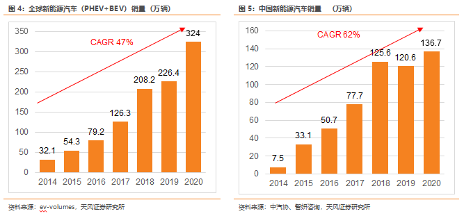 中国新能源汽车销量增速高于全球,2020年中国新能源汽车销量达到136.7万辆。根据EV-volumes公布的数据,2014年全球新能源汽车销量为32.1万辆,2020年达到324万辆,2014-2020年复合增长率为47%;根据中国汽车工业协会公布的数据,2014年中国新能源汽车销量为7.5万辆,2020年达到136.7万辆,2014-2020年复合增长率为62%;整体来看全球与中国新能源汽车销量皆快速增长,且中国的增速高于全球。