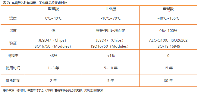 车规级IGBT对产品性能要求要高于工控与消费类IGBT。作为汽车电气化变革的关键制程,IGBT产品在智能汽车中具有不可替代的作用。由于汽车电子本身使用环境较为复杂,一旦失效可能引发严重后果,所以市场对于车规级IGBT产品的要求要高于工控类与消费类IGBT产品。相比工控与消费类IGBT,车规级IGBT对于温度的覆盖要求更高、对出错率的容忍度更低、且要求使用时间也更长。