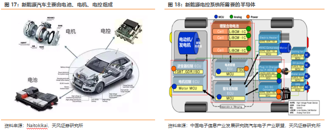 新能源汽车核心-三电系统(电池、电机、电控)。1)电池是新能源汽车的能量来源,替换传统燃油汽车的油箱;动力电池系统主要由电芯、电池管理系统等组成。2)电机负责将电能转换为机械能,包含定子、转子等;3)电控如同汽车的大脑,用来控制电机的启动、暂停、转速、扭矩等各项“动作”。三电系统需要大量的半导体产品包括功率半导体、模拟芯片、控制芯片等;随着电动汽车的发展与普及,汽车半导体迎来快速发展期。