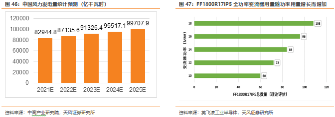 IGBT用量将随风电变流器需求瓦数增长而增加。随着碳中和相关政策的逐步出台,我国风力发电将迎来新一轮机遇,根据中商产业研究院预测,2021~2025,我国风力发电量将从82944.8亿千瓦时增长至99707.9亿千瓦时。风电的普及也将带动风电变流器需求的增长。更多的风电变流器需求量也意味着风电市场对IGBT的需求量将大幅增长。因此,IGBT用量将随着风电普及而提升。