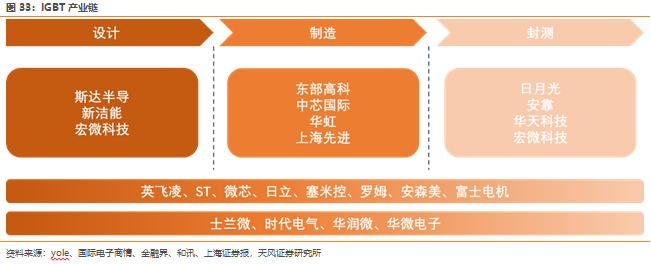 特色工艺需要工艺与设计的积累,海外企业以IDM为主。功率半导体主要以特色工艺为主,器件的技术迭代像逻辑、存储芯片依靠尺寸的缩小,因此特色工艺的要求更多需要行业的积累与know-how,包括工艺、产品、服务、平台等多个维度;功率器件产品性能与应用场景密切相关,导致平台多、产品类型多,因此更注重工艺的成熟度和稳定性,工艺平台的多样性。在这样的背景下,由于IDM可以按需生产不同电性功能的功率器件,加速技术及应用积累,在深度及广度上覆盖客户不同的需求,因此IGBT海外的企业大多的生产模式以IDM为主,国内相比海外发展较晚,因此催生出Fabless找代工厂生产的模式,专业化分工加速对海外的追赶。代表IDM型IGBT厂商包括英飞凌、瑞萨、Vishay、罗姆、安森美、富士电机、士兰微、华微电子等;Fabless型IGBT厂商包括斯达半导、新洁能、宏微科技等。IGBT代工厂则包括高塔、华虹、东部高科等厂商。