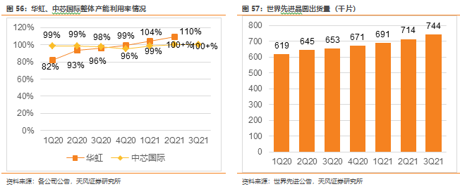 晶圆供应维持紧张,代工厂产能利用率不断攀升。随着下游需求持续向上,带动功率器件、模拟芯片、MCU等产品需求的增长,该类产品多在8英寸晶圆厂生产,导致8英寸晶圆需求一直保持高位。同时,疫情催生需求增长,导致晶圆供应紧张华虹等代工厂产能利用率持续保持增长态势;世界先进晶圆出货量也持续增长。