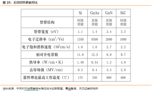 第三代半导体物理特性相较于Si在工作频率、抗高温和抗高压具备较强的优势。半导体材料领域至今经历了多个发展阶段,相较而言,第三代半导体在工作频率、抗高温和抗高压等方面更具优势。第一代半导体材料主要包括硅(Si)和锗(Ge),于20世纪40年代开始登上舞台,目前主要应用于大规模集成电路中。但硅材料的禁带宽度窄、电子迁移率低,且属于间接带隙结构,在光电子器件和高频高功率器件的应用上存在较大瓶颈,因此其性能已难以满足高功率和高频器件的需求。