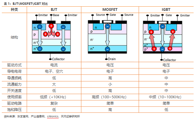 IGBT结合了MOSFET与BJT的优势。IGBT结合了MOSFET与BJT的优点,既有MOSFET的开关速度快,输入阻抗高、控制功率小、驱动电路简单、开关损耗小的优点,又有BJT导通电压低、通态电流大、损耗小的优点,此外为了提升IGBT耐压,减小拖尾电流,结构相对复杂。IGBT被各类下游市场广泛使用,是电力电子领域较为理想的开关器件。