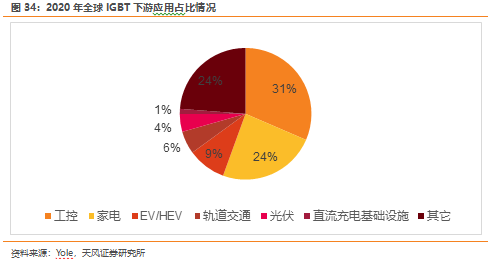 IGBT下游应用包含工控、家电、新能源汽车等,2020年市场规模达到54亿美元。根据Yole,2020年,全球IGBT市场规模约为54亿美元,预计将于2026年增长至84亿美元。IGBT具有多个下游应用市场,主要包括工控、家电、新能源汽车、新能源发电、轨道交通等。其中,工控是IGBT最大的下游应用市场,2020年,工控在全球IGBT下游应用中占比约为31.48%、家电占比约为24.07%、EV/HEV占比约为9%。