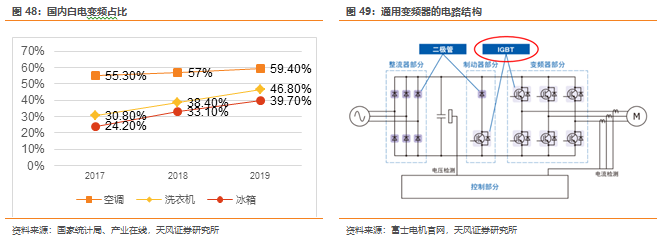 变频家电渗透率提升促进IGBT用量增长。近年来,我国白色家电产品销量已趋于稳定。冰箱销量保持在8000万台左右,洗衣机销量保持在6000万台以上,空调销量保持在14000万台以上。虽然白电整体销量已趋于平缓,但变频家电的渗透率的增长仍为IGBT用量带来了提升空间。家电用变频器内置IGBT,截至2019年,空调、冰箱以及洗衣机的变频占比分别为59.4%、46.8%以及39.7%,仍有较大成长空间。因此,家电用IGBT市场有望随着变频家电渗透率的提升而进一步扩大。
