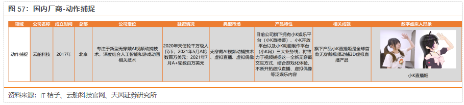 海外厂商主要聚焦于产业链基础层的建设,因起步较早,综合实力强于国内厂商。在技术领域方面,有一部分海外厂商如Intel、Microsoft、Google以及Meta(Facebook)这类综合型厂商提供全栈式的技术服务。也有一部分海外厂商从不同的技术细分上发力,其中包括人工智能,渲染建模,动作捕捉以及VRAR的应用等。在AI虚拟形象生成技术厂商中,主要有Soul-Machine、Oben以及Loom.ai等厂商提供个性化的人机交互系统来强调拟人化的情绪带来的商业价值的提升。在渲染建模方面,主要海外厂商有Epic Games、Unity以及NVIDIA等。其开发的引擎Unreal engine、Unity以及NVIDIA Omniverse提供了3D实时模拟和协作的工具和平台。关于动态捕捉的海外厂商有关注光学动态捕捉技术的VICON、Motion Analysis、Opti Track,以及关注惯性动作捕捉技术的Xsens等。在VRAR方面,主要有Wave和Stageverse这样的海外厂商使用VRAR技术向用户提供虚拟服务的平台以及应用程序。