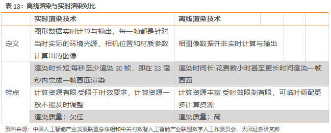 渲染技术也可分为实时渲染技术和离线渲染技术,二者在渲染时长、计算资源计算量等方面存在差异,所对应应用场景亦有所不同。