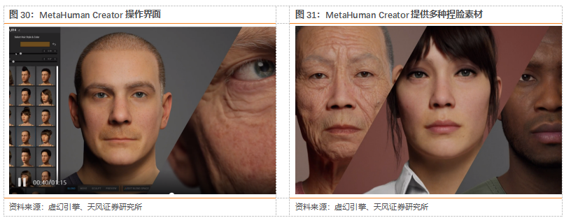 游戏引擎作为虚拟世界的卖水人,有望破圈助力多行业数字人打造。以Unity,Unreal 两大游戏引擎为首,游戏引擎的强大性能使得数字人形象拟真度进一步提升。