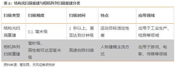 静态扫描建模技术可分为结构光扫描重建和相机阵列扫描重建,结构光扫描重建扫描时间长,对于人体这类运动目标在友好度和适应性方面都差强人意,更多的应用于工业生产、检测领域。相机阵列扫描重建替代结构光扫描重建克服了以上问题成为人物建模主流方式。随着拍照式相机阵列扫描重建得到飞速发展,目前可实现毫秒级高速拍照扫描(高性能的相机阵列精度可达到亚毫米级),并成功应用于游戏、电影、传媒等行业。