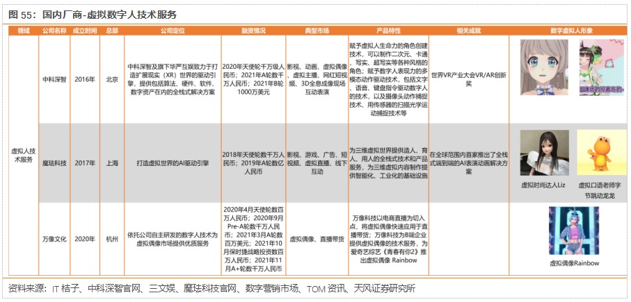 国内厂商在产业链基础层、平台层和应用层发展较为均衡,虚拟数字人从开发到落地的体系逐渐趋于完整。基础层相关厂商主要着力点在人工智能、动作捕捉、建模渲染以及虚拟数字人的技术服务。科大讯飞、捷成股份、新华网、标贝科技、追一科技和小冰等专注人工智能,云舶科技专研动作捕捉,环球墨非、亿真科技、虚谷未来科技、半人猫、叠镜数字、相芯科技以及Tatame等专注建模渲染,中科深智、魔珐科技和万像文化等负责虚拟数字人的技术服务。产业链平台层建设为虚拟数字人运营,主要包括虚拟数字人的外观设计、包装、宣传、落地和培养,相关企业有上海禾念、乐华娱乐、动图宇宙、次世文化、创壹视频、虚拟影业、魔塔时空和世悦星承等。应用层主要投入在游戏、直播、动画、影视、音乐以及社交平台等,应用于娱乐和营销。腾讯音乐、芒果超媒、奥飞娱乐和哔哩哔哩等将虚拟主播和虚拟偶像等应用于娱乐内容。蓝色光标、浙文互联、引力传媒、星期六(遥望网络)、华扬联众和天下秀等已推出或筹备推出虚拟IP形象,着重广告营销,星期六(遥望网络)预计推出虚拟数字人与真人的互动直播。中国移动、阿里巴巴、腾讯、百度、网易等综合型厂商支持旗下相关公司或事业部向虚拟数字人赛道发力。