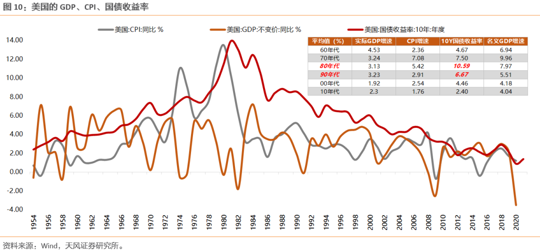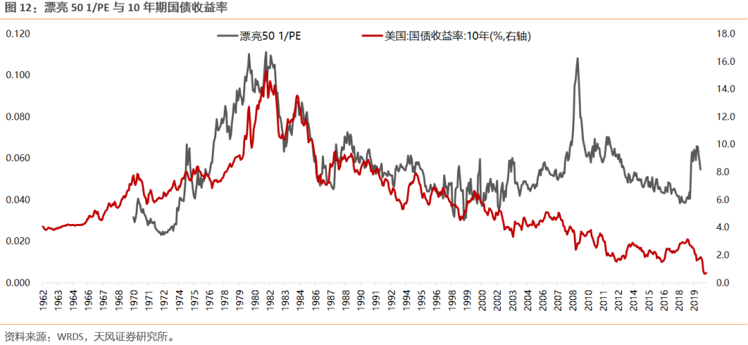 PEG中的G取值标准也不一,吉姆 斯莱特用的是未来12个月的预测增长率,彼得 林奇强调的是中长期的增长率,可用未来2-3年的盈利增速预测值。在使用过程中,也有使用当年净利润增速或过去2-5年复合增速来推测中长期增长率的。从PEG指标的使用目的(给予持续成长型公司定价)来看,理论上应多考虑业绩复合增长的持续性,盈利增速预测取越长时间越好,但盈利预测依赖于市场的一致预期,存在预测准确性的误差。另外,不同口径计算的PEG对当年选股(涨跌幅)有效性的差异,可参考本文第三部分的量化统计结果。综合来看,PEG的分母G采用1-5年的预测值都是可取的。不管是吉姆 斯莱特还,是彼得 林奇都把“PEG=1”认定为合理估值水平,彼得 林奇认为:最理想的投资对象,其PEG值应该低于0.5;PEG在0.5-1之间,是安全范围;PEG大于1时,就要考虑该股有被高估的可能。但有两个因素会影响PEG的中枢水平:(1)风险成本,如果两家公司的预期增长率相同,那么高风险公司的PEG应低于低风险公司的PEG,或者说盈利波动性大的公司,其PEG应低于盈利确定性高的公司;(2)利率成本,PEG和PE类似,都是利率敏感型的估值指标,在贴现率下降阶段,估值中枢自然会抬升。“PEG=1”这个认知的背景来自两位大师活跃的年代,90年代以及更早期。彼时,美国的国债收益率和无风险收益率都非常高,80年代,美国10年期国债平均利率高达10.6%,90年代,平均利率也有6.7%。随着量化宽松及潜在经济增速的回落,美债收益率持续走低,2010以来,10年期国债平均利率水平回落至2.4%,且仍有进一步下行的趋势。美股估值水平随着利率下行而中枢抬升(1/PE与利率变化同向),也从标普500和漂亮50的估值变化中得到佐证。