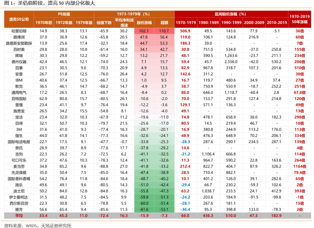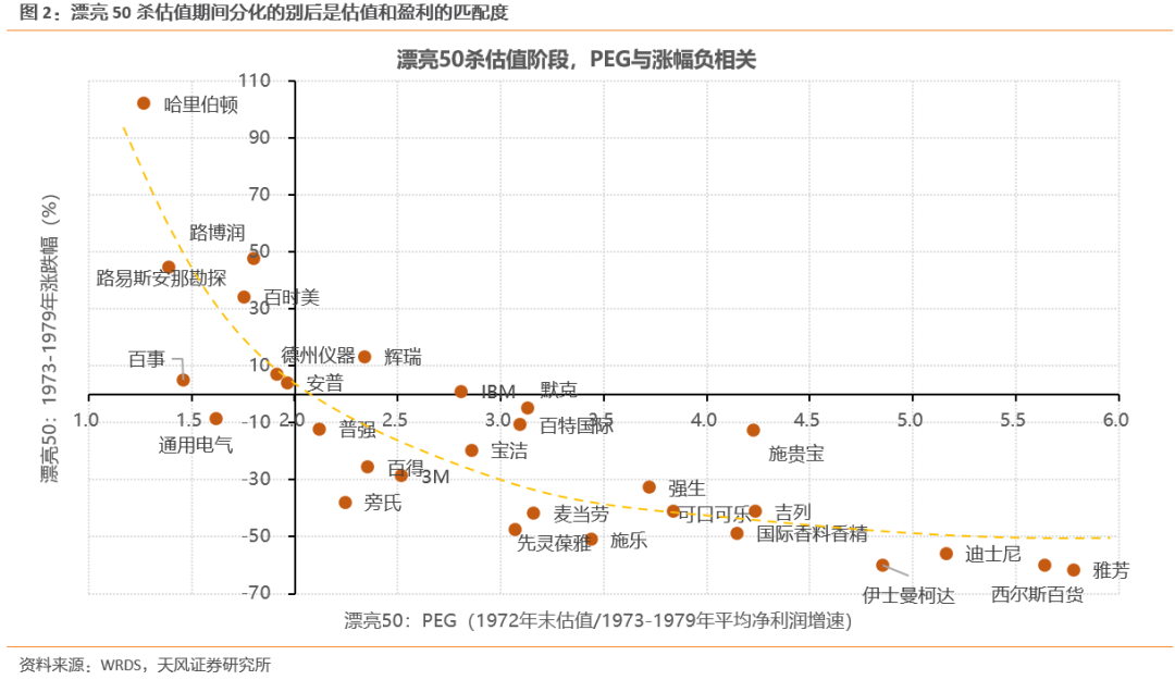 年初以来,随着核心资产的【少部分公司牛市】的极致化演绎,我们提出了【开辟超额收益的新战场】,在200-500亿的公司中寻找性价比更好的、未来的核心资产。春节后,市场也开始挖掘估值(PE)与增速(G)更匹配的资产,似乎这一思路直接指向的正是PEG这一指标,也因此带来了一小波PEG选股热潮。类比73-79年漂亮50消化估值、β都不利的阶段,股价表现分化极大。美股漂亮50涨跌幅与PEG负相关关系明显:PEG(1972年末估值/1973至1979年均净利润增速)处于1-2之间的、估值泡沫较低的个股,在杀估值阶段基本仍维持正收益。看到上面这张图,大家肯定会有一个疑惑,PEG究竟等于多少是合理?多少算低估?这里我们先概括的提出几个结论,可能会颠覆大家的认知,正文部分,我们会详细做出解释:(1)市场普遍所理解的“PEG=1是合理的估值,小于1会比较好”并不准确,也不完备。(2)PEG指标的使用前提是持续盈利、稳定增长(可预测性),即能用DCF估值的公司,才能算PEG。因为理论上来说,PEG中的PE是用DCF贴现出来的合理PE估值。(3)而用DCF贴现出来的合理PE估值,又会受到不同时代的不同宏观环境的影响,即受到不同利率环境的影响,合理PE不同,那么合理的PEG也就自然不同。(4)因此,PEG的用途应当在于横向比较不同类型核心资产的相对性价比,(正如上图2所示)。(5)而大部分A股中的非头部核心资产,即增长持续性不确定或有周期性的资产,不应当使用PEG来衡量贵贱。在我们理解的估值定价框架里,A股市场上的公司大致可以分为两类:(1)一类是可用DCF定价的核心资产,这类资产的特点是有可持续增长能力,能够看长期,此时盈利的可持续增长是长期回报率的来源,而ROE决定了可持续增速率的天花板,即G=ROE*(1-d);在这类头部核心资产中,比较相互之间的性价比,可以采用PEG的方式。从长期视角来看,资产价格长期走势跟随绝对盈利水平(EPS),盈利的可持续增长是长期回报率的来源。这一点,不管是从指数(标普500、上证综指)的长期走势,还是典型可持续增长个股(茅台、长江电力等)的长期走势来看,都能看出明显的规律。长期的回报率追求的是盈利增长的持续性。拥有可持续增长能力的资产,可用现金流贴现模型进行定价,ROE决定了可持续增速率的天花板高低,G=ROE*(1-分红比例)。对于这类资产,我们可以计算出理论上的估值中枢(PB、PE、PEG等)。而对于DCF估值模型,除了长期增长率之外,另一个核心变量是贴现成本,包括两方面:一是风险成本,来自盈利增长的稳定性或可预测性;二是市场的利率水平,估值都是利率敏感型指标,利率下行,估值中枢抬升。(2)另一类是增长持续性不确定或有周期性的资产,对于这类资产,理论上来说,不能采用PEG定价,更多是【炒业绩】的逻辑,即市场更倾向于用短期高增长(增速G)给予定价,当年扣非增速更快的公司往往表现更好,此时,回测发现(针对扣非增速在30%以上的公司)估值高低反而不是决定超额收益的核心因素。在A股市场中,能看长期可持续增长的公司毕竟还是少数,对于大部分公司来说,市场中短期走势会更关注盈利增速(边际变化)。从中短期维度来看(1年),盈利增速高低决定相对收益高低。此时,市场更注重的是短期盈利的爆发力。这类资产自然也不能用DCF进行定价,估值也非短期走势的关键。我们将全市场所有个股每年的扣非增速分为10组(第1到10组由高到低),统计每组每年涨幅中位数,结果显示:在大部分年份,不管市场是牛市、熊市、还是震荡市,不管风格是蓝筹还是成长,也不管板块轮动是快还是慢,一年维度的涨跌幅基本与当年的景气度(扣非增速)呈现单调正相关的情况。最后,我们将估值与短期增速结合来看:绝对高增长和绝对负增长情况下,估值对1年维度的涨跌幅没有区分度;但0-30%的增长区间,低估值的相对收益更高。换句话说,对于有短期爆发力的资产,当年涨幅取决于当年盈利增速G,炒报表很有效。而PEG的高低一般情况下不会成为上涨的制约(例外的情形是当年高增长但第二年增速大幅下滑的公司,股价表现也会比较弱)。而对于增速相对较低的公司(30%以下),估值的高低就比较关键。这其中也包含了可以看可持续增长的核心资产,DCF定价给予一个估值描,买入估值的高低多数情况下决定了预期回报率的高低。因此,本文对于PEG的讨论事实上也是基于长期维度(可持续增长)视角下的一个延伸。PEG这一指标,市盈率与盈利增速的比值,因90年代以来彼得 林奇的大力推崇而闻名于世。但其最早的使用者应该是英国投资大师吉姆 斯莱特,在他的几本著作中(《祖鲁法则》、《超越祖鲁法则》等)也有较详细的分析。本篇报告的正文部分,借鉴前人的一些经验,我们将对PEG做一些深入的讨论,回答当前大家所关注的几个问题:1. PEG的使用有哪些误区?