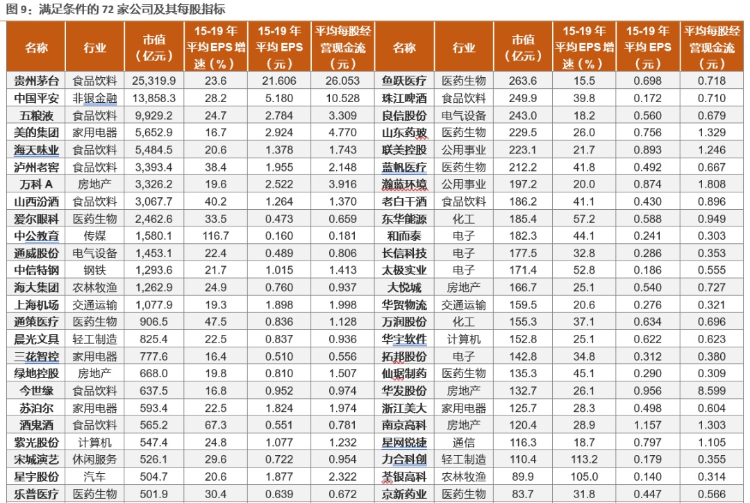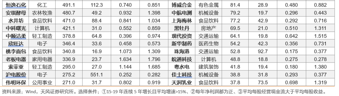 PEG衍生于PE,主要是用来衡量成长股的估值与成长性是否匹配。因为对于不同行业、不同发展阶段、不同公司,不同增长潜力对应着不同的估值水平,PEG比率恰恰提供了一种横向对比的参考依据,比如对于低估值低增长、高估值高增长之间性价比的比较。但PEG这一指标在实际操作过程中,也容易陷入一些误区。PEG的建立初衷就是解决成长股估值的问题,自然是适用于成长型的公司。这一观点并没有分歧,但对于“成长”的界定却众说纷纭。吉姆 斯莱特对成长型公司的界定以及PEG使用条件,给出了几条标准:①至少连续4年增长、②过去5年不能有亏损、③过去5年每股平均现金流大于每股收益。而在他所活跃的90年代,吉姆 斯莱特得出了“PEG指标应用在PE为12-20倍、EPS增长率在15%-30%的股票效果最好”的结论。因此,对于“成长型公司”的界定,字面直观的理解最为合适——每股收益能够持续增长、同时有较好现金流支撑的公司。PEG指标在一定程度上解决了不同类型个股横向对比问题,而成长股之所以能享受更高的PE,主要在于市场预期公司未来能够持续增长。第一类:强周期行业多数不满足。周期性盈利波动难以满足连续增长的要求,但是对于部分行业集中度牌提升过程中的周期龙头,满足连续增长条件,也可称之成长型公司。第二类:融资依赖型或项目依赖型公司多数不满足。因为增长的预期不稳定、现金流也较差,常见于比如环保类、园林类、基建类等公司。第三类:概念类公司多数不满足。微利甚至亏损的公司,较难给出明确增长预期,一般也不用PEG来估值,还有一类是并购依赖型公司也是如此。没有持续盈利、稳定增长的基础,自然也就很难用PEG给予合理估值。总的来说,PEG指标是基于盈利增长率存在一个较为稳定的年度基础以及可预测周期这个前提假设。但事实上,能满足持续盈利、稳定增长的标的也是稀缺的。我们按:①15-19年连续5年增长且平均增速>15%、②15-19年每年净利润都为正、③15-19年平均每股经营现金流大于平均每股收益,这几个标准,仅筛选出了72家公司。如直观理解,这些标的主要分布于盈利较为稳定的大消费、公用事业、交运等行业中,也存在部分周期或科技行业龙头。![]()
