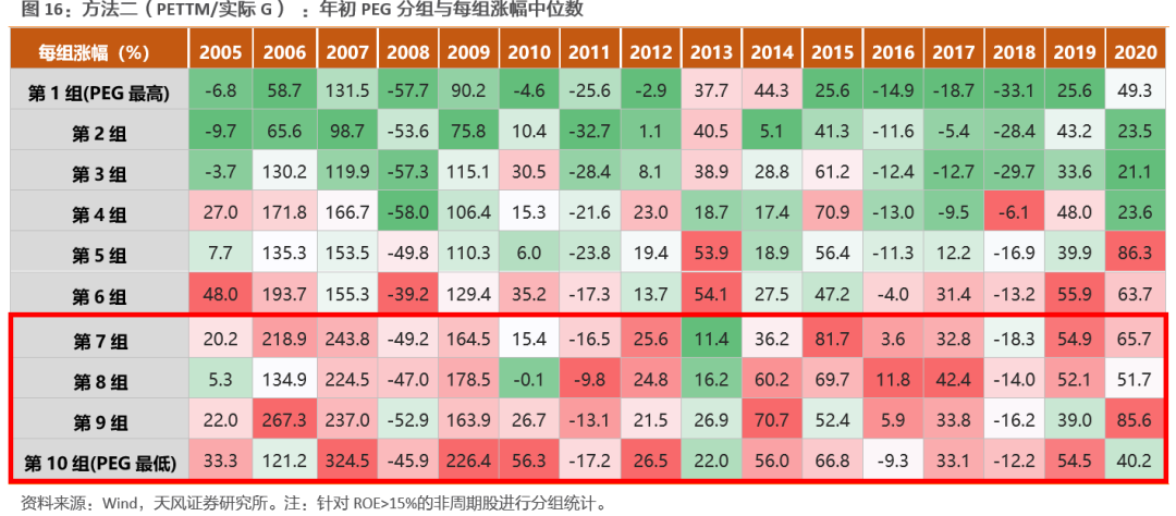 (6)若能较准确地预测当年的盈利增速,那么在年初买入低PEG的个股,大概率能获得超额收益(当年涨幅与年初PEG高低有显著的负相关性)。