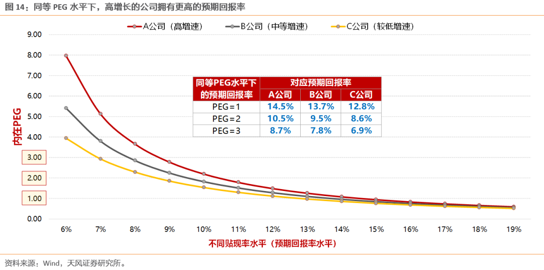 (3)“PEG=1”是基于美国80-90年代高利率环境的一个经验法则,但并非恒定真理,PEG和PE类似,都是利率敏感型的估值指标,合理PEG中枢随着利率下行而抬升。