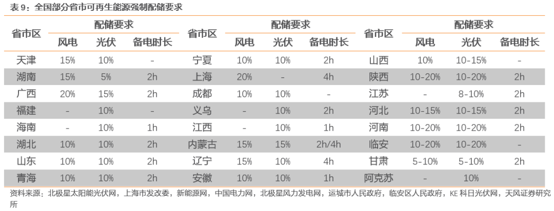 新能源+储能:多个省份提出明确新能源配储要求(比例多在5%-20%之间),推动储能产业规模快速扩张,但“繁荣发展”背后,由于其缺乏明确调用及收益机制,发电侧自建储能压力较大。