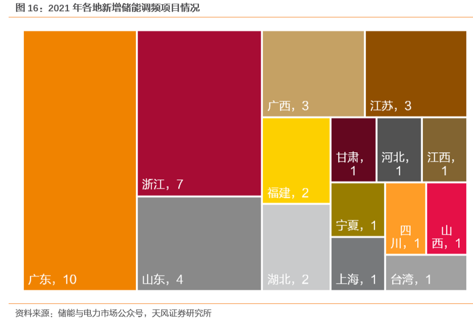 火储联合调频:火储发展初期受补偿政策影响,广东、内蒙、山西等区域收益水平显著,发展优势明显,但该市场目前总体资金池相对有限,伴随电站规模快速扩张,总体资金池将被迅速瓜分,早期发展较快区域开始趋于饱和,补偿标准表现出降低趋势。在此背景下,火储联合调频市场开始向其他区域拓展,据储能与电力市场统计,2021年,新增项目(规划、建设、投运)涵盖广东、江苏、浙江、福建等15个省市,涉及近40个项目。