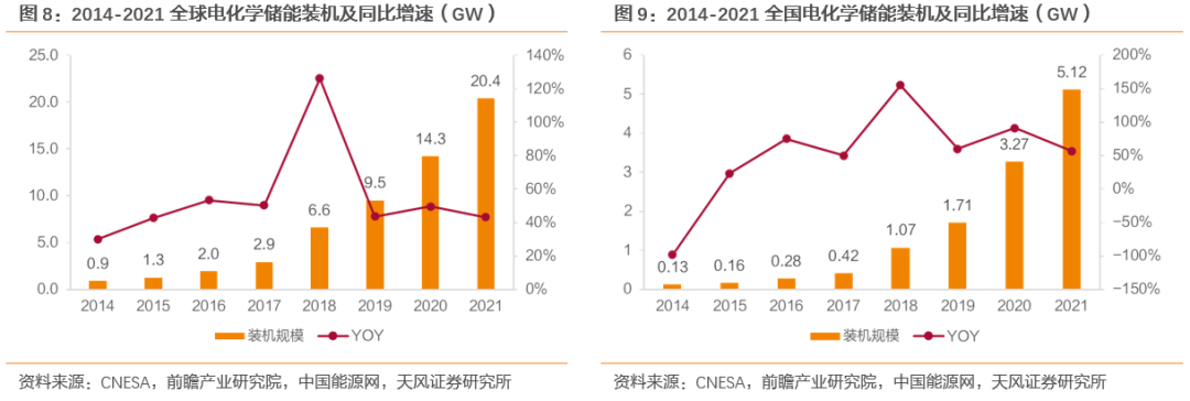 双碳目标下新能源装机维持高增速,装机规模占比不断提升,给电网带来较大考验,储能成为新型电力系统下的必要环节。但传统抽水蓄能受制于自然条件约束及响应速度较慢问题,难以完全满足新能源装机规模快速扩张下的调峰调频需求。以电化学为主的新型储能近年来取得快速发展,截至2021底,国内电化学储能装机规模为5.12GW,2014-2021年CAGR达69.0%。