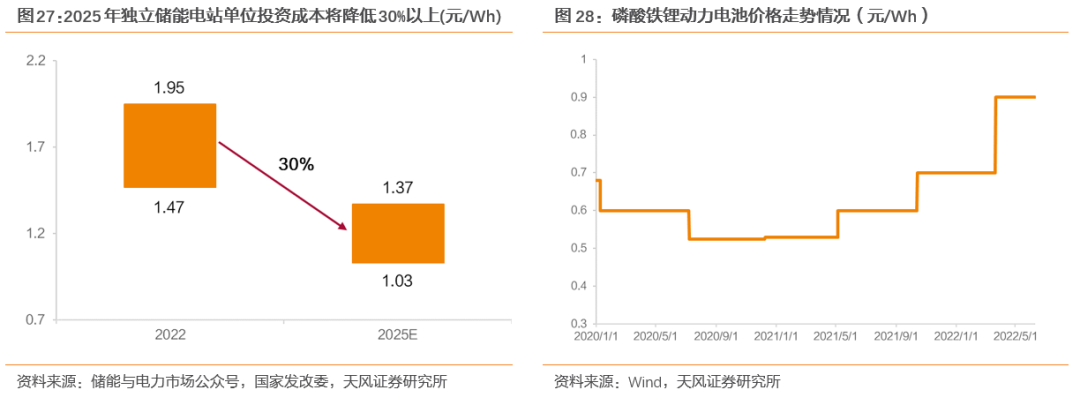 独立储能:新型储能产业“探索初期”将过,规范化与市场化加速推进。而独立储能电站一方面更加贴合政策导向,相比于依附于发电侧的商业模式,独立储能电站规范性与主体性更强;另一方面,在辅助服务市场逐渐向独立储能放开的背景下,独立储能电站有望满足发电侧、电网侧等多方需求,通过参与调峰、调频等电力辅助服务及容量租赁来扩宽收益渠道,从而有效解决经济性难题。同时,独立储能电站参与电力现货市场交易确定性逐渐增强,市场化机制有望打破资金盘掣肘,进一步提高项目收益水平。根据测算,在综合考虑现货市场交易+容量租赁的情况下,山东独立储能电站项目全投资IRR达13.01%,资本金IRR达26.50%,收益率可观,已具备较强的投资价值。